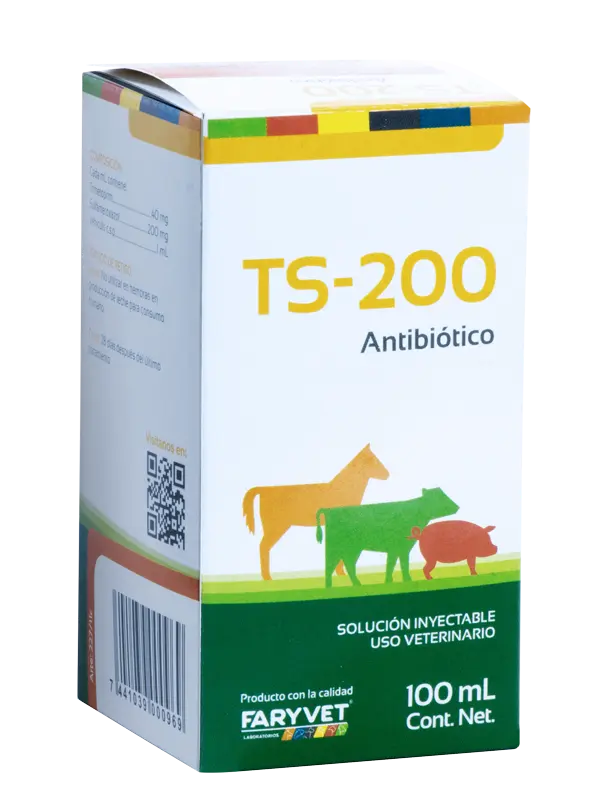 TS-200 es un antibiótico inyectable de amplio espectro indicado para el tratamiento de diversas infecciones bacterianas, contribuyendo a una recuperación rápida y efectiva del animal.
