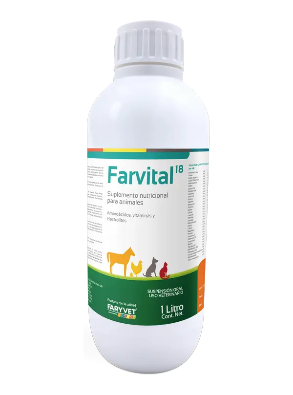Farvital-18 es un suplemento nutricional líquido con aminoácidos, diseñado para apoyar la recuperación, estimular el apetito y mejorar el estado general del animal.